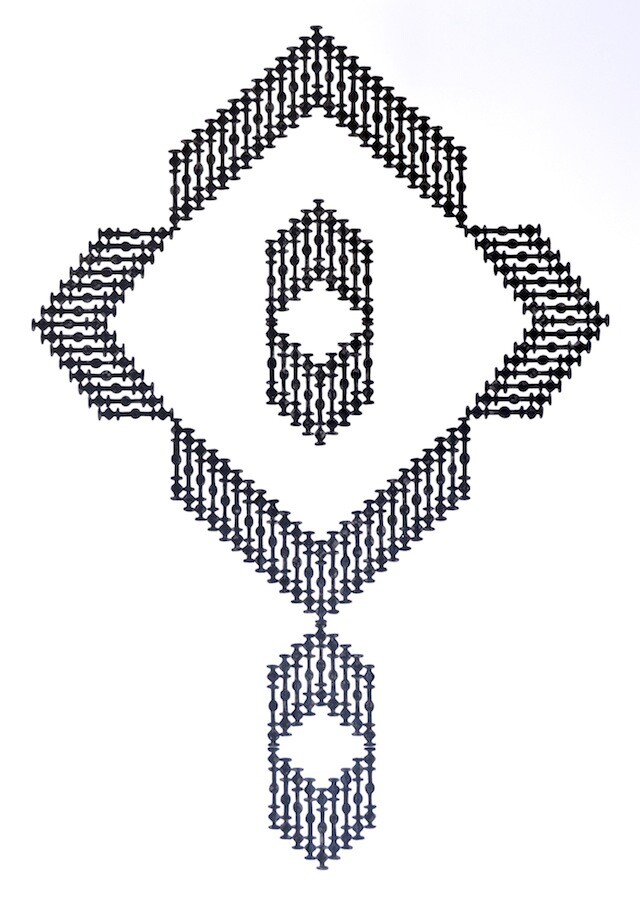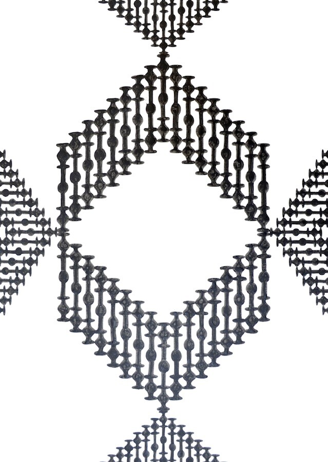 Tawakol’s Egyptian roots are integral to her work with arabesque patterns and Middle Eastern traditions. The show will also include series of works based on textile and architectural motifs to further illustrate Tawakol’s concept of interrupted communication. A single shape is isolated and taken out of its usual context and put back into a bigger shape, or an ornament, where it vanishes as a single unit.
