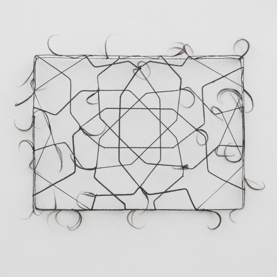 Her sculptures with hair imitate the structure of traditional Egyptian hijab, yet instead of hiding a women’s hair, Tawakol exposes them and defeats the purpose of the hijab. What should be hidden (the hair) becomes a mask or a veil itself. What remains behind the mask is simply the empty volume of a person, and the woman imagined underneath disappears.