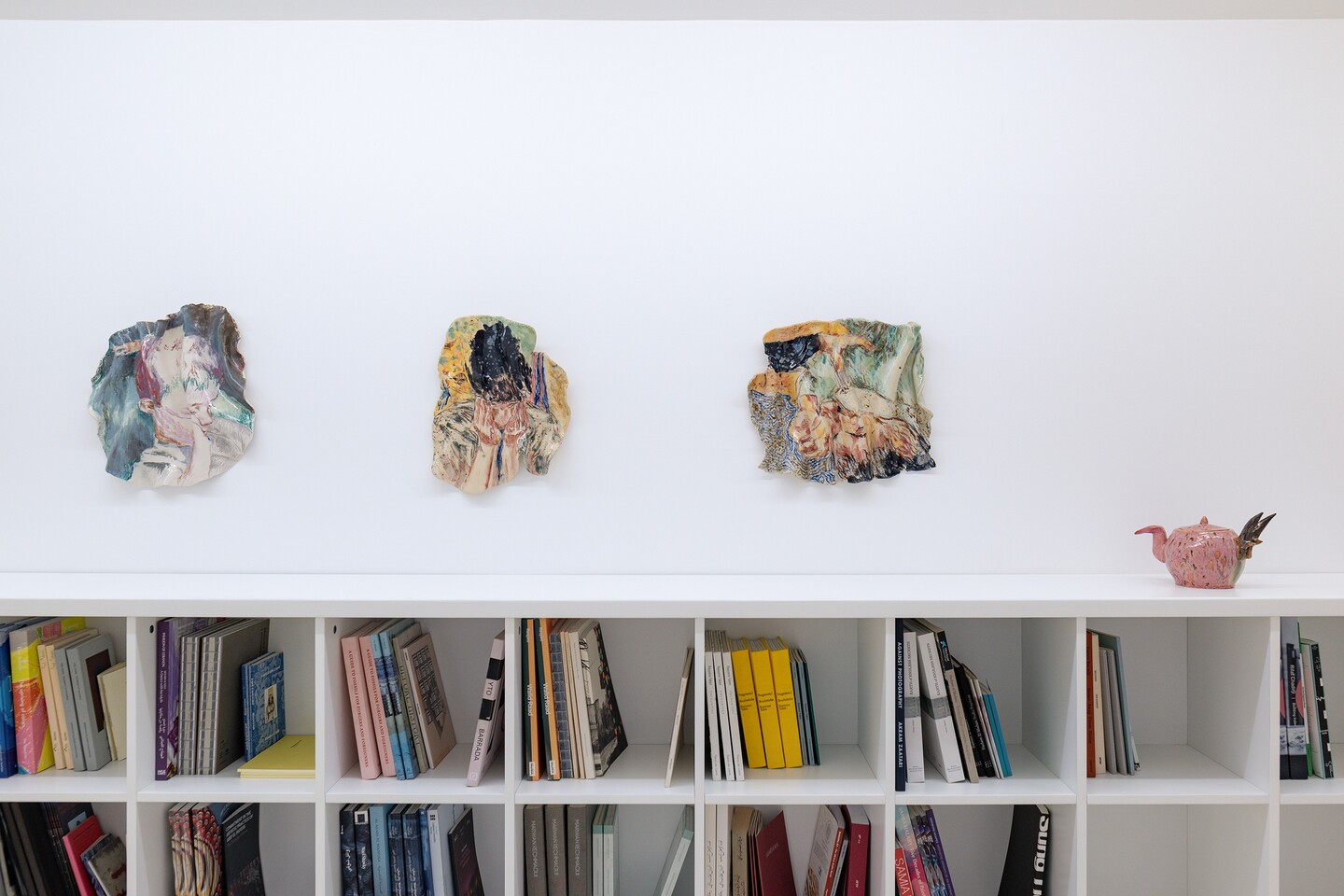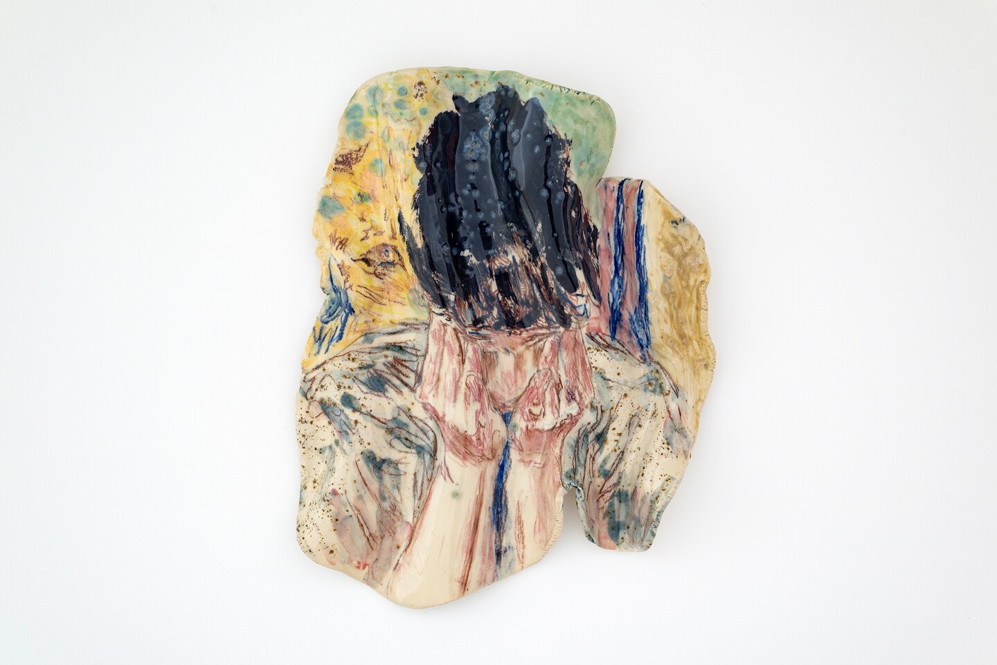 Forming a counterpart to the paintings, a series of ceramic sculptures lines the gallery wall. Kiwan shapes the clay into folds, fires it, and then paints portraits, faces, arms, or hands, before firing the pieces a second time. The heat of the kiln melts the paint and allows glaze particles to drip, softening the contours of the depicted bodies and bringing their felt experiences into sharper relief. What might look at first glance like isolated details, or fragments of life, actually forms a body of work that draws the viewer into a space of emotional and sensory engagement.