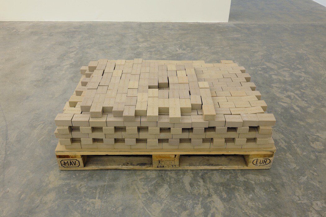 The entrance of the gallery features an installation of traditional natural soap to be distributed to visitors. The soaps are inscribed with an Arabic saying that translates to, “no condition is permanent”. The work is set in a block, resembling a brick wall, however, it contradicts this as it is in its nature to dissolve.