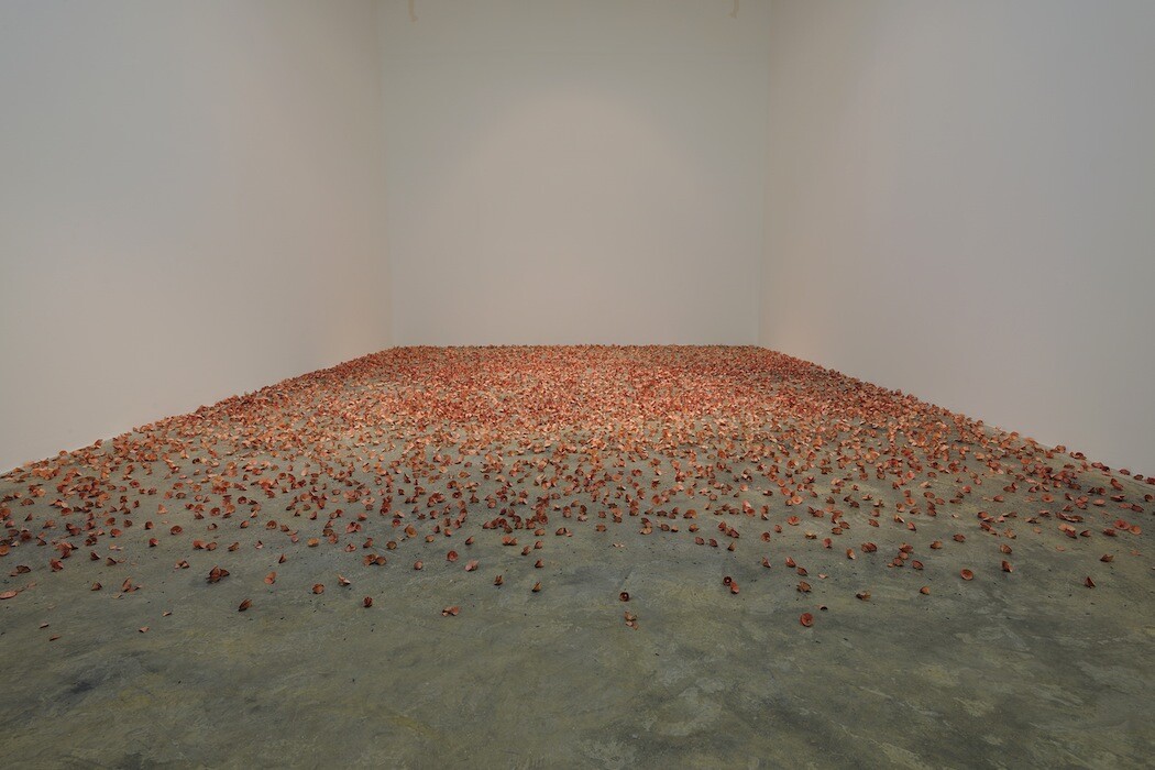 Batniji often works with media that disappear or disintegrate over time. In his performance installation, Hannoun (a Palestinian poppy), which was first presented in the Palestinian Pavillion at the Venice Biennale in 2009, Batniji demonstrates the impermanence of life and memory. Inspired by a childhood memory of sharpening pencils in order to avoid completing an assignment, the artist indulges in an almost cathartic ritual of sharpening the pencil and leaving the discarded blooms of fragile shavings to fall to the floor. The work carries strong symbolism to fallen fighters, which the poppy traditionally represents. Hannoun can be seen as an intimate space of meditation, yet it is still inaccessible. This draws on Taysir state of flux in between Gaza and Paris. His practice is intrinsically linked to Gaza yet he is unable to have a stable practice there.