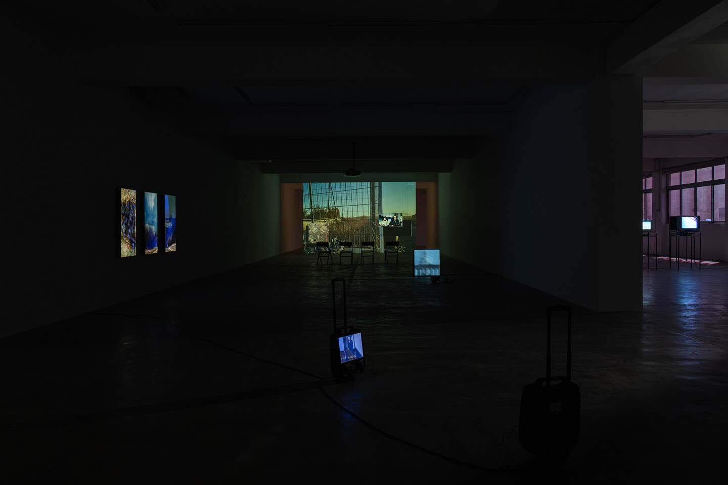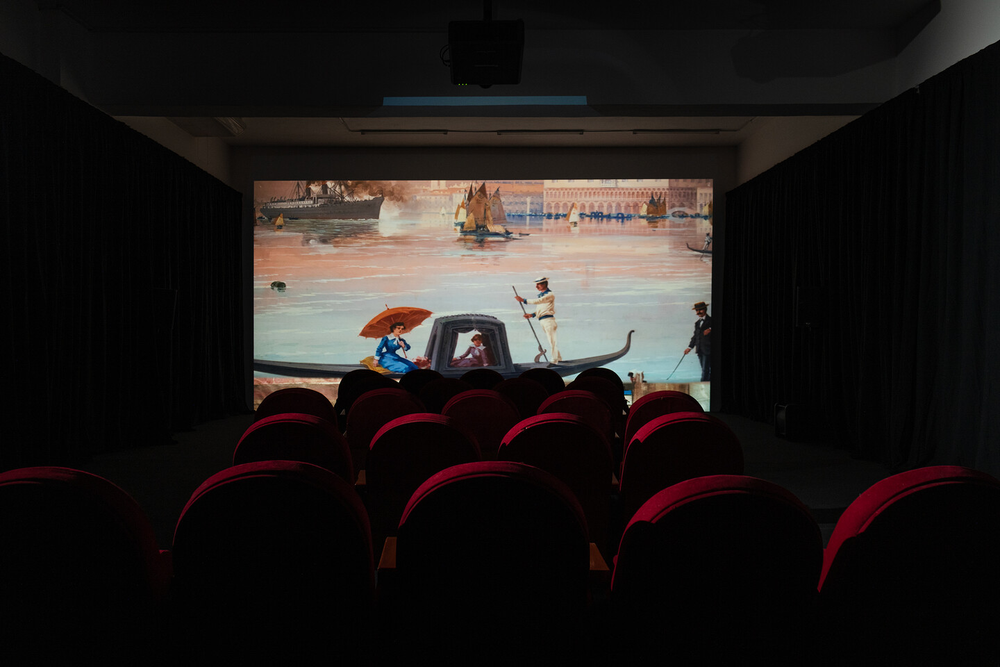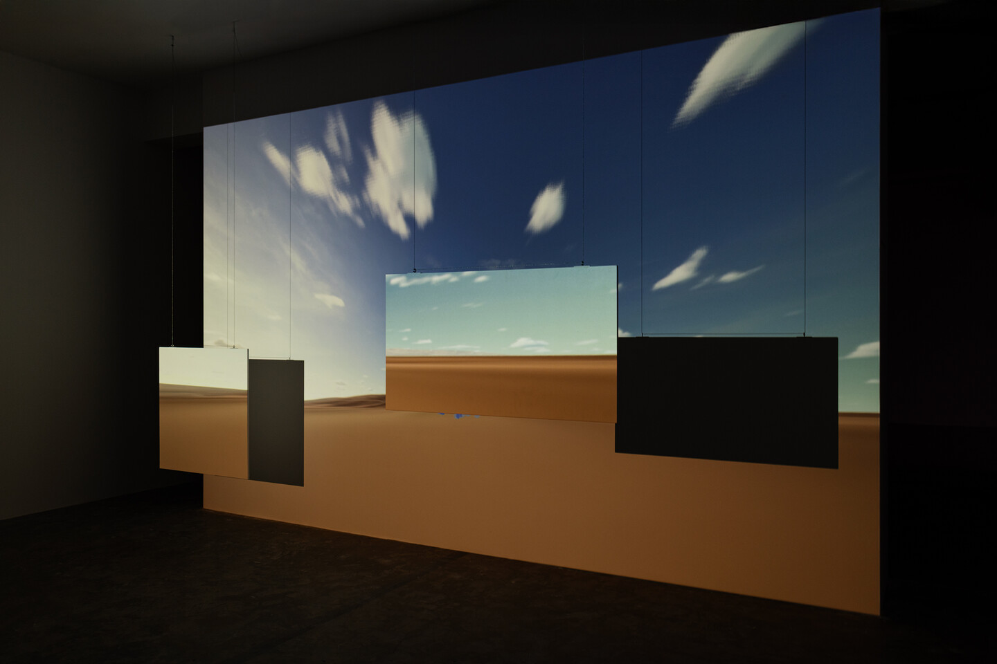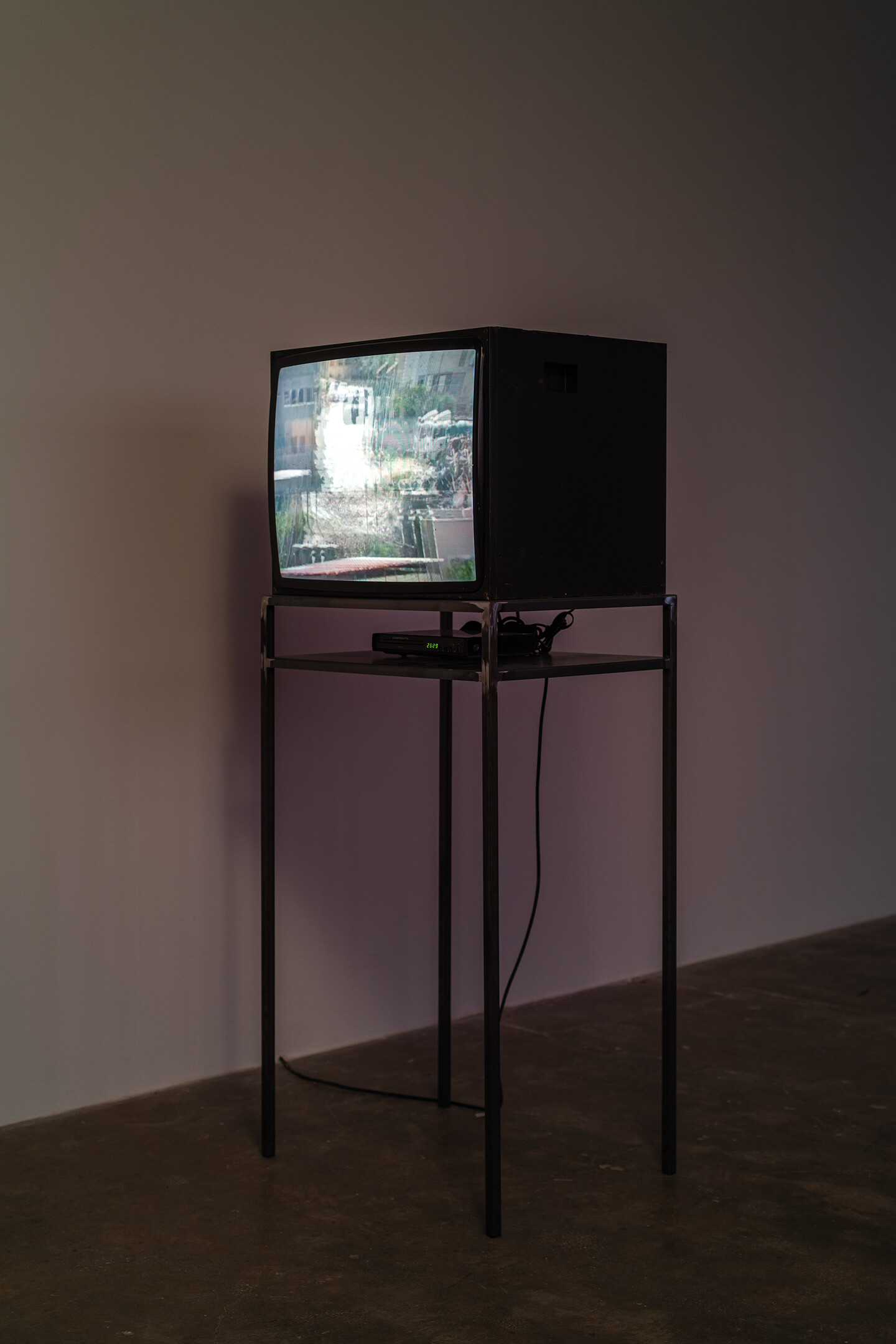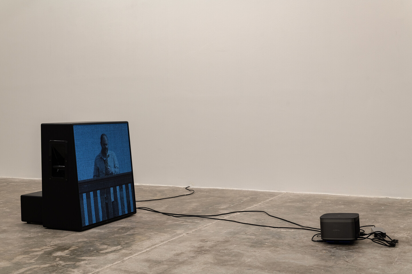 single-channel video projection, color, sound, amplifier, 53 × 20 × 20 cm, (amplifier), 71 × 70 × 25 cm (speaker)