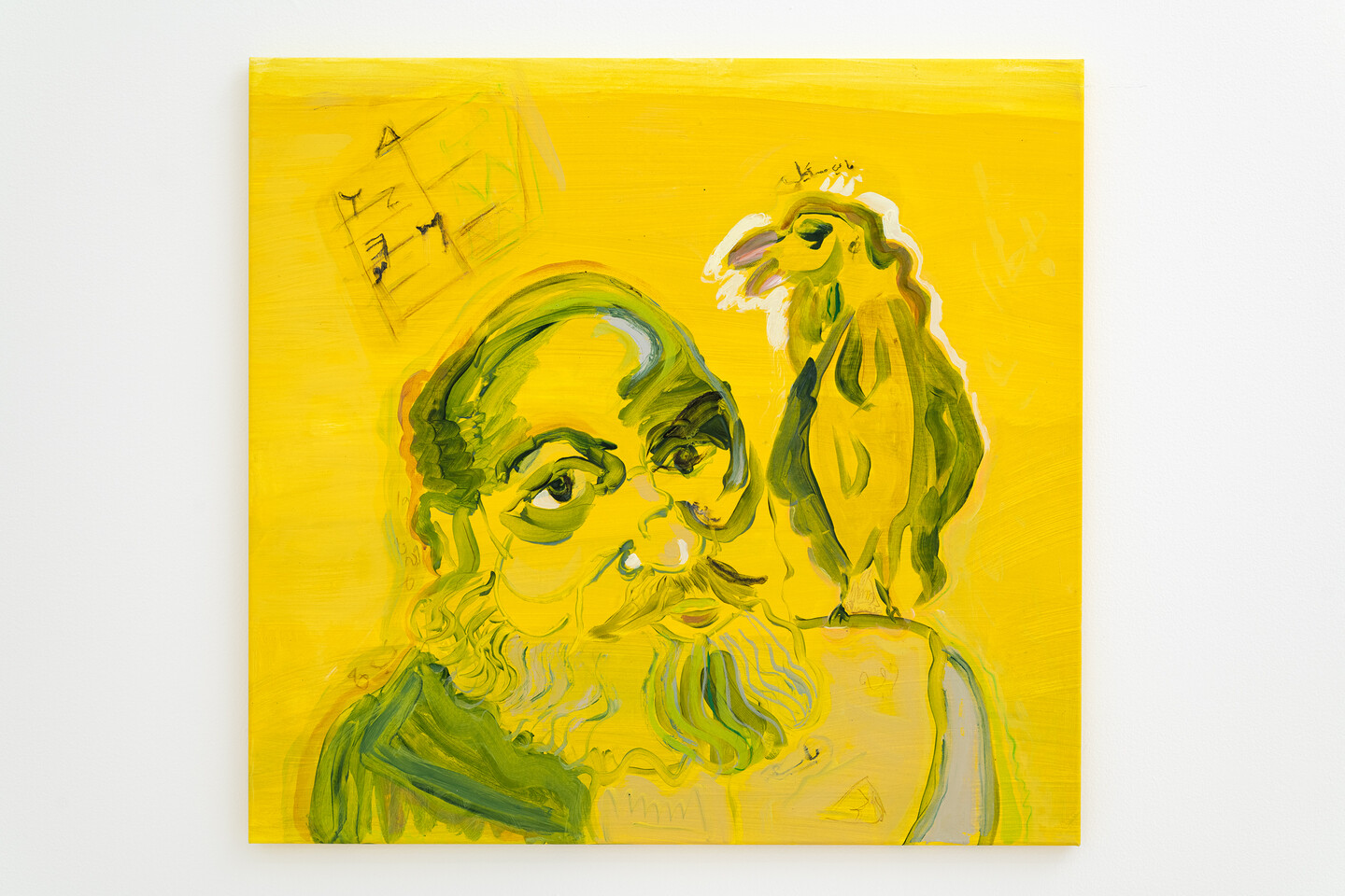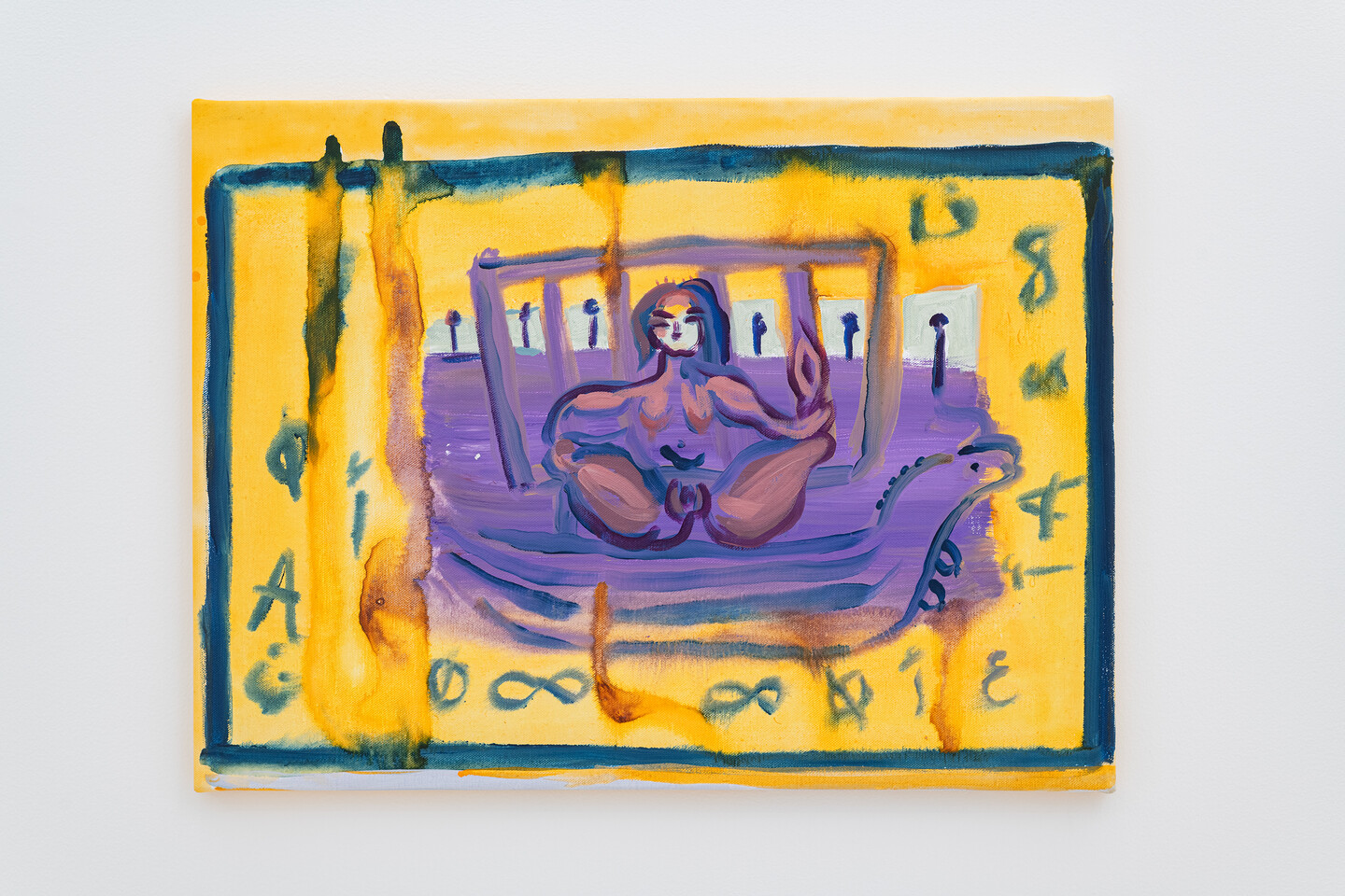 This tension between ancient references and modern times surprises visitors throughout the exhibition. From the ceramic mural pieces to the trompe l’oeil paintings on canvas, Mounira Al Solh intertwines motifs found on antique mosaics, bas-reliefs or Phoenician lettering with depictions of boats, or female figures, all the while keeping to an earthy color palette. In one of the larger works on canvas, the artist combines yellow natural pigments and Phoenician red to reimagine Europa. Instead of being abducted by him, the princess here cradles the half-human-half-bull Zeus, in a stance that negates the damsel in distress narrative. Two sculpture heads clutching their faces with their hands rethink the act of crying as a performative ritual, hollowed out at the top to leave room for a lachrymatory.