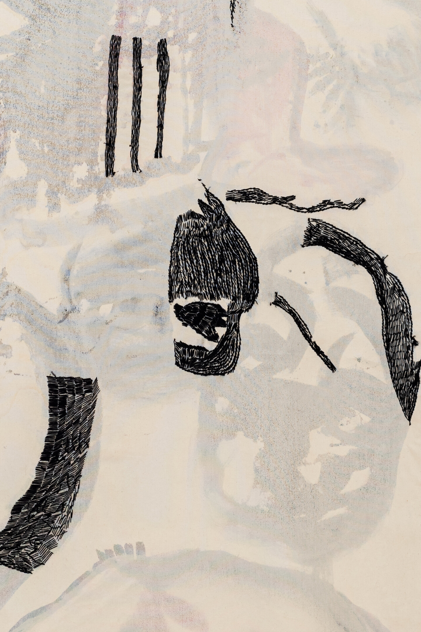 The exhibition highlights moments of violent rupture, from ancient myths to the ongoing armed conflicts, tracing layers of persistent trauma that have consistently driven many into exile. Yet, within this tide of loss, the artist weaves a fragile thread between past and present, navigating a liminal space heavy with the weight of war’s relentless force, but at the same time playful in its resistance.