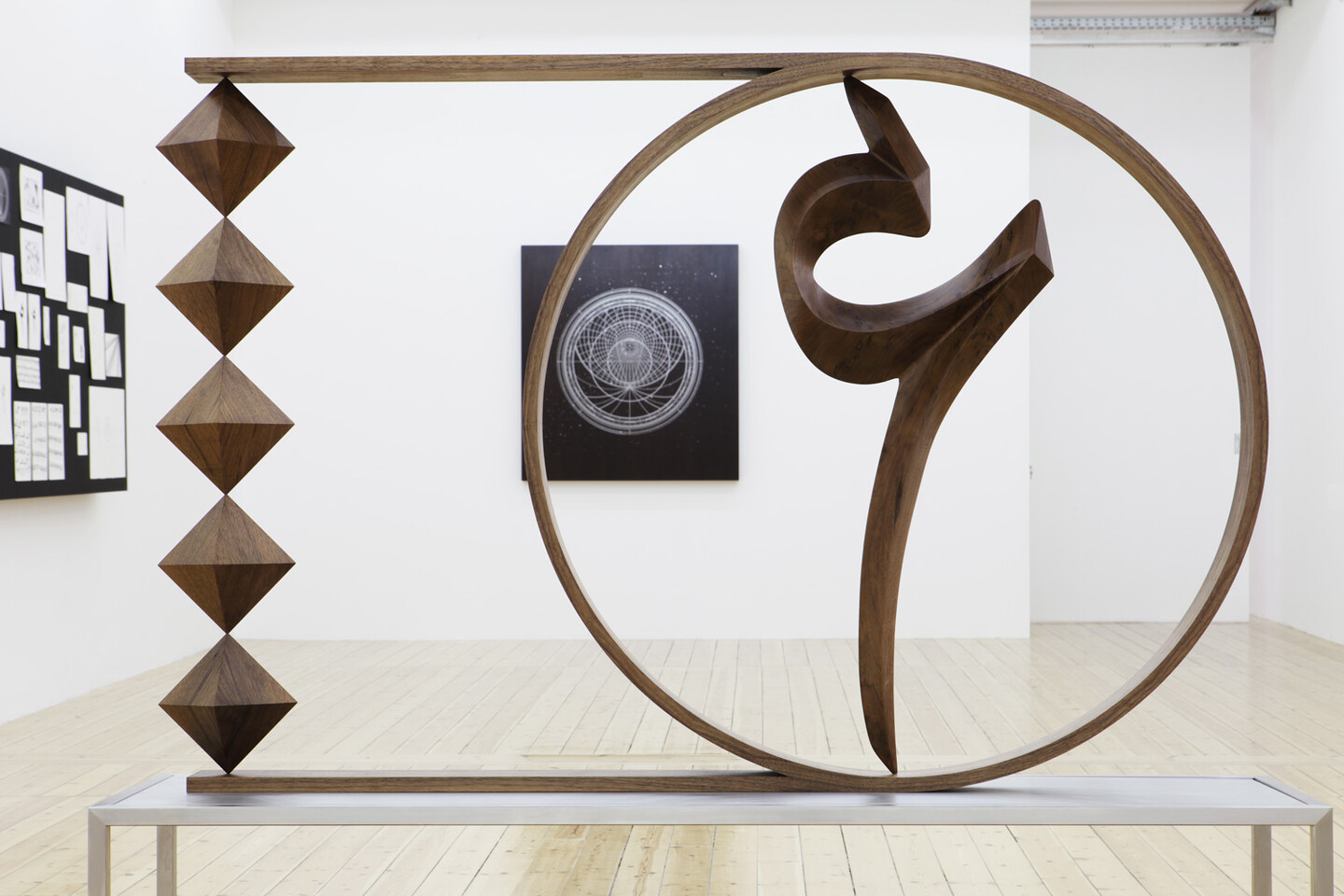 This process is made visible through a variety of ink on paper drawings, creating a sort of ‘mind map’. The final steps of the reconstruction are two large wooden sculptures, each showing one of the missing unknown letters.