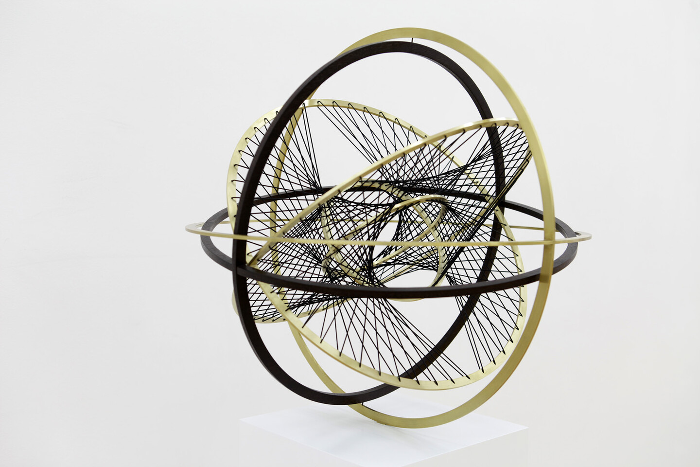 wood, brass, thread, 55 × 55 × 55 cm, Base: 103 × 30 × 30 cm