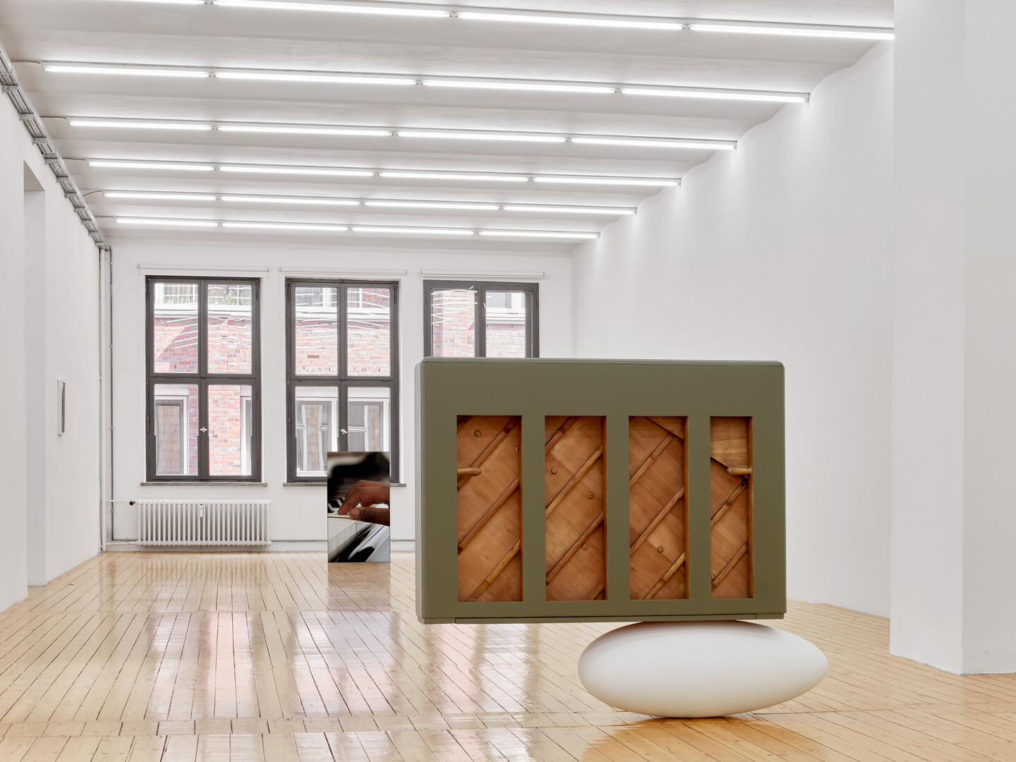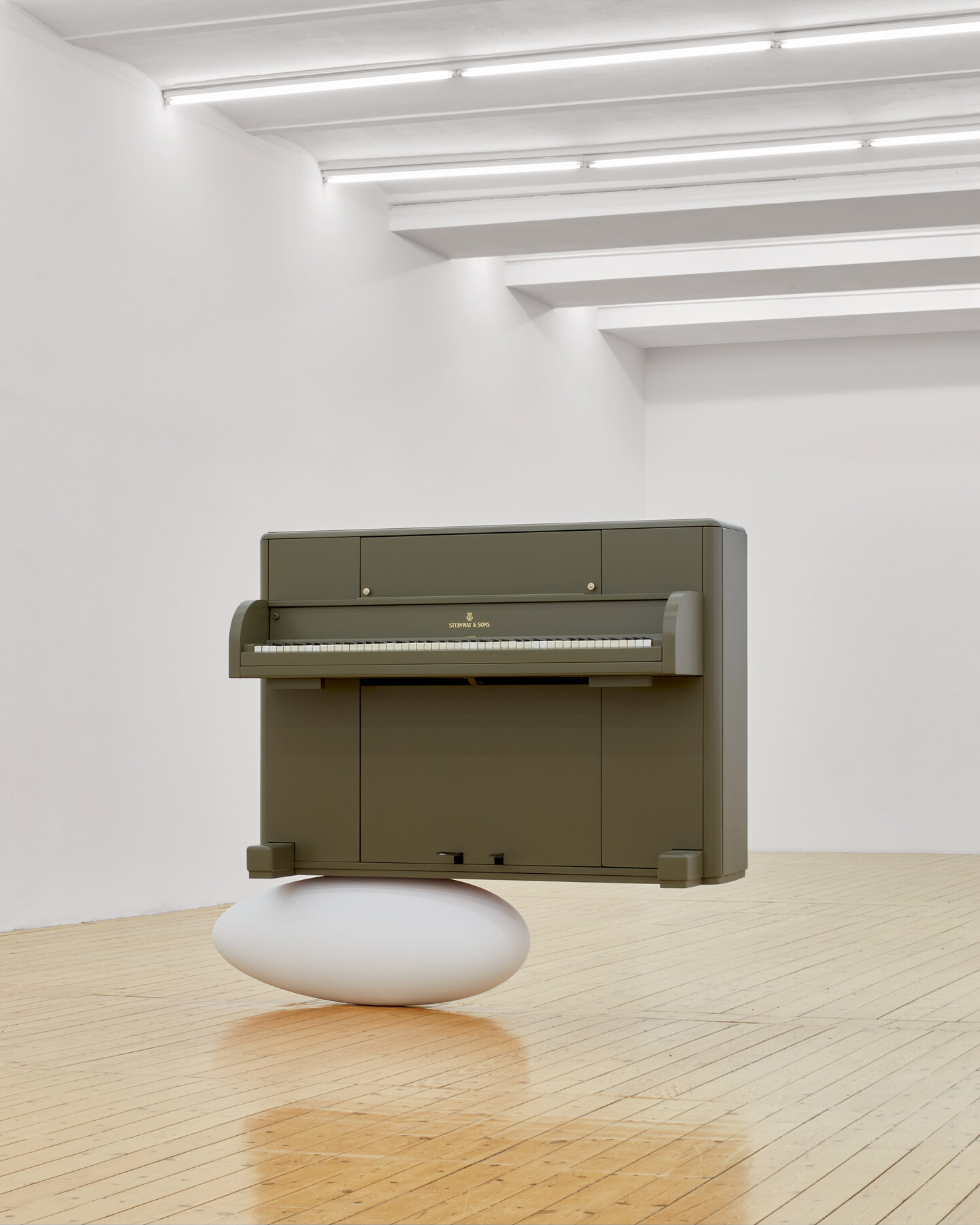 Kiswanson engages with this charged legacy through the careful restoration of one such unique piano. Removed from its original utilitarian function, it is installed in the gallery, detached from its protective casing. The instrument levitates above a child-size white cocoon, in a sculptural gesture that reimagines the wartime relic as a symbol of the historical rupture it embodies, echoing music’s transcendent and recreational potential.